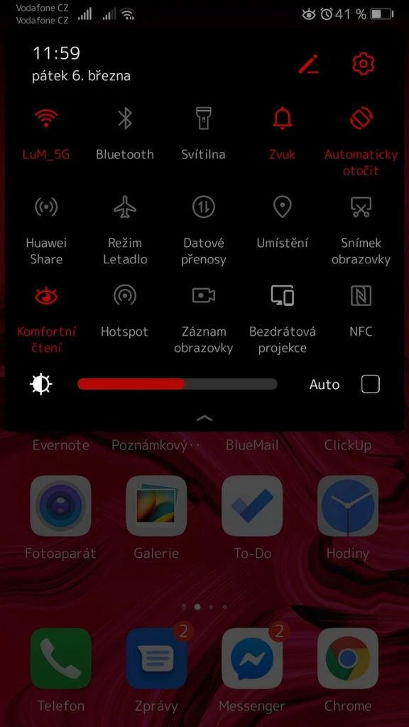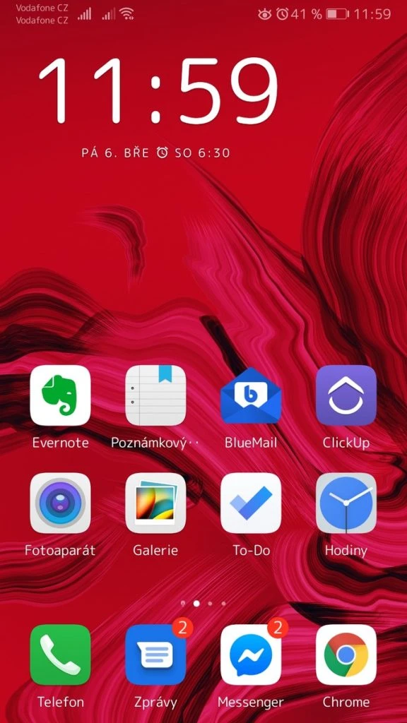 V některých telefonech neproběhne změna automaticky, a je potřeba přejít do předinstalovaného správce motivů, kde se stažený motiv zobrazí mezi ostatními. Na Huawei / Honor je velmi hezký motiv Warlike, který kombinuje sytě černou a červenou barvu.
